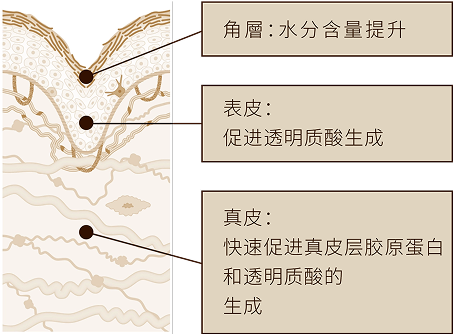 通过促进肌肤自身生成透明质酸、增加水分含量,令肌肤恢复柔韧弹性,同时提升真皮层胶原蛋白密度,从而改善细纹。