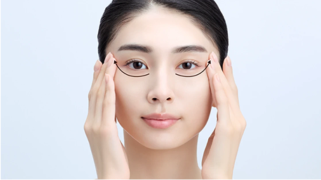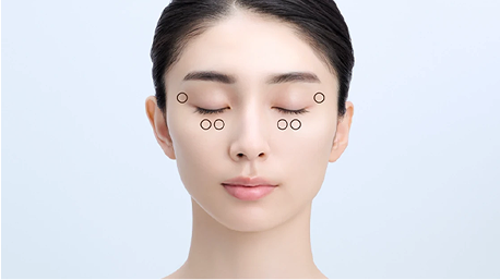用双手的中指与无名指指腹,从眼下中心向外侧轻柔按压至吸收。