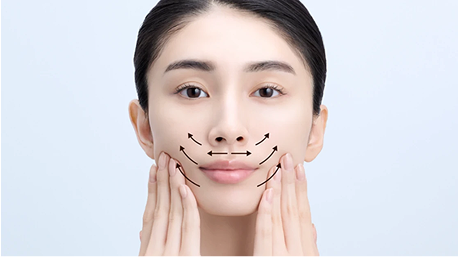 额头部位请用双手的中指与无名指指腹,由下至上轻柔涂抹。