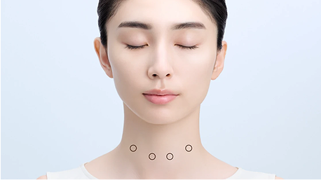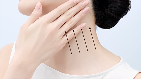 右手轻抚左侧颈部,左手轻抚右侧颈部,由下至上轻柔涂抹。