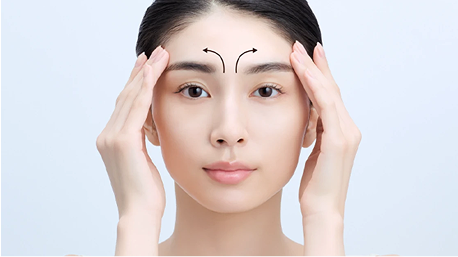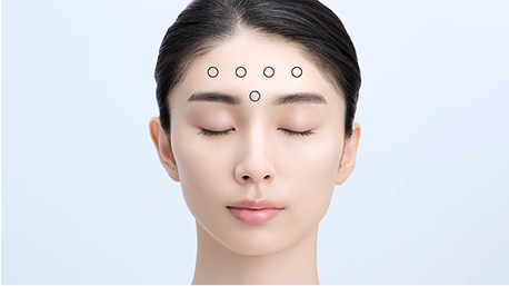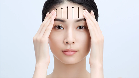 眉间部位,请用双手的中指与无名指指腹,由下至上轻柔涂抹。